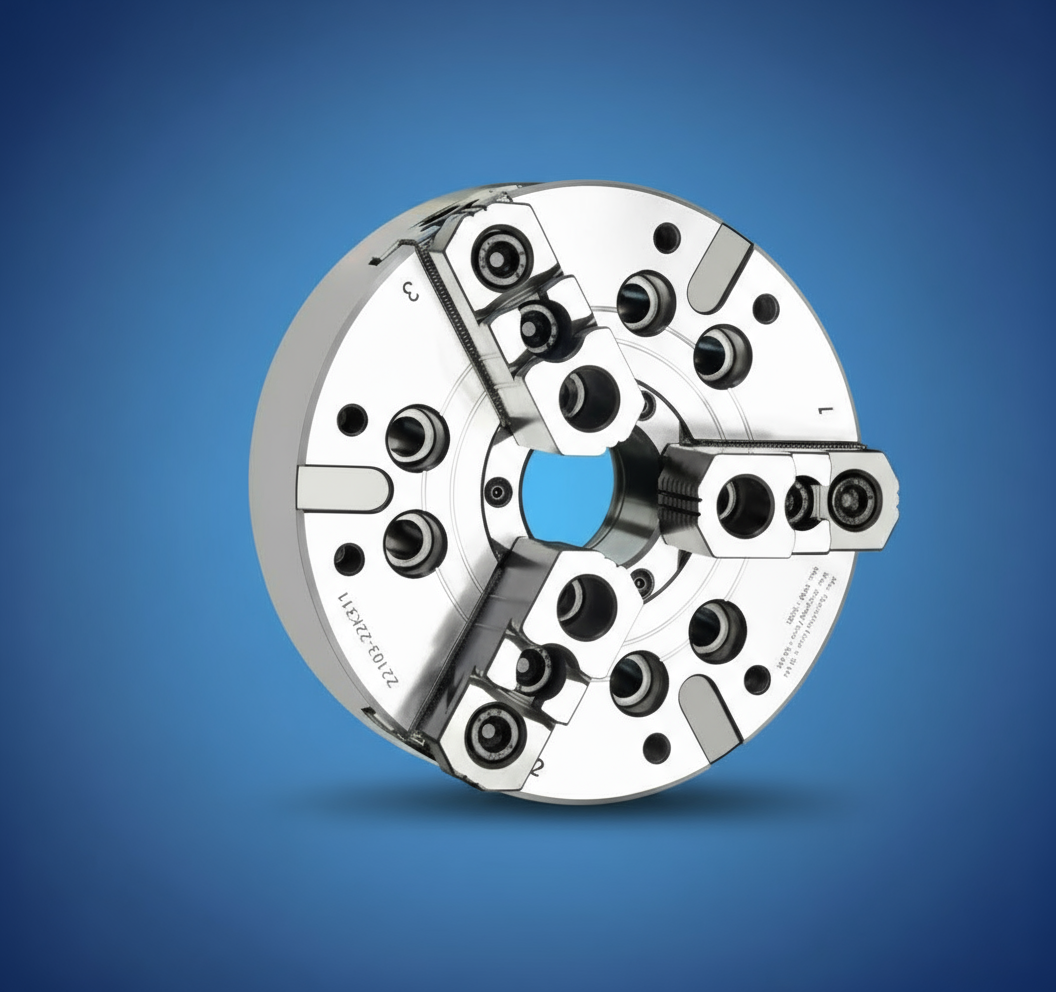 Robust 3-Jaw Big Bore Power Chuck for large-diameter round parts. Balanced and precise.
